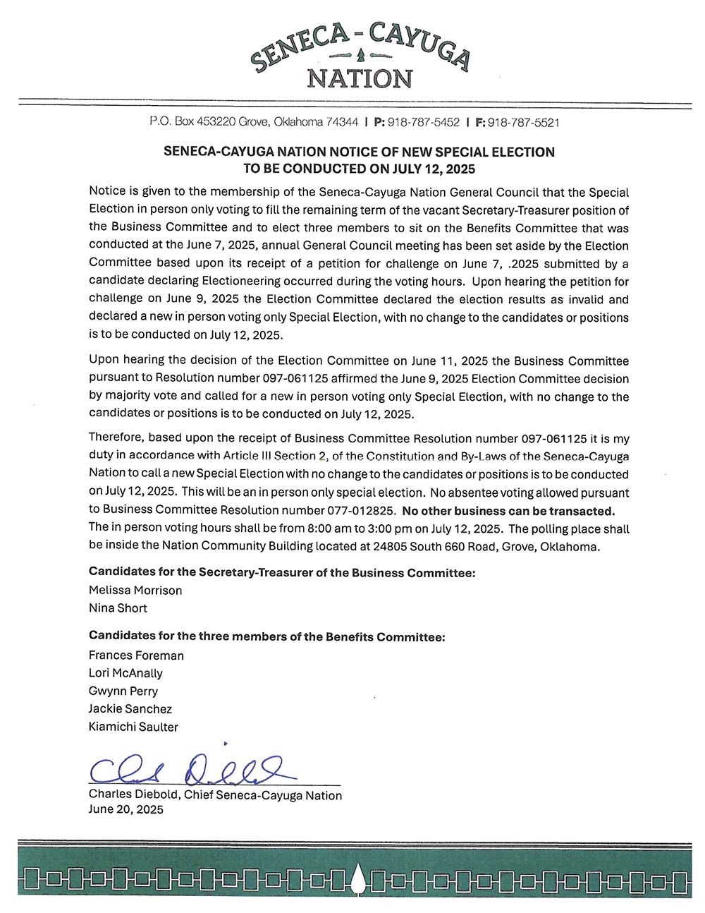 Seneca-Cayuga Nation Notice of New Special Election to be conducted on July 12, 2025.